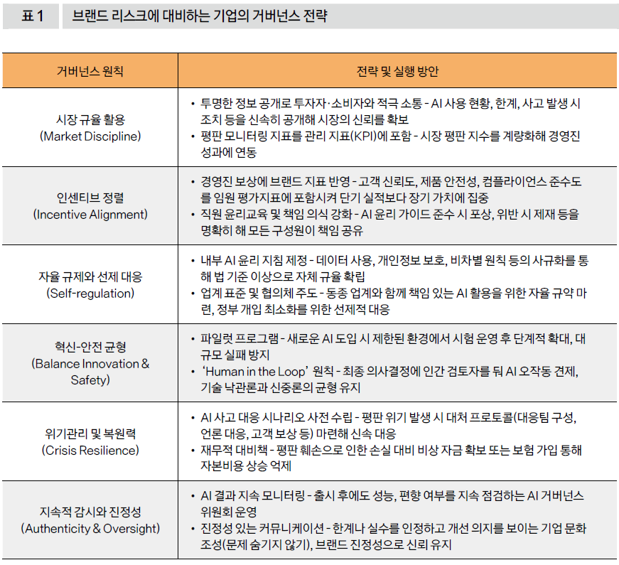 앞서 논의한 내용을 바탕으로 기업이 브랜드 리스크에 대비해 설계해야 할 거버넌스 전략은 [표 1]과 같이 정리할 수 있다. 시장 원리의 활용, 내부 유인 체계 정비, 자율 규제와 투명성을 키워드로 요약할 수 있다: