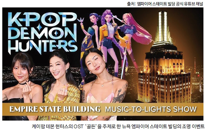 OTT 플랫폼에 공개된 콘텐츠가 팬덤과 SNS를 매개로 화제성을 이어가는 가운데 뉴욕 엠파이어 스테이트 빌딩에서 ‘골든’ 조명 이벤트가 열리는 등 도시 랜드마크로 확산되는 흐름도 눈에 띈다. 국내 담론이 주로 ‘케이팝 IP의 성공’이나 ‘한국 애니메이션의 약진’에 초점을 맞췄다면 해외에서는 ‘새로운 문화 해석 방식’과 ‘참여형 팬 경험’에 큰 의미를 부여했다. 2025년을 마무리하는 시점에서 케데헌을 다시 분석해야 하는 이유다.