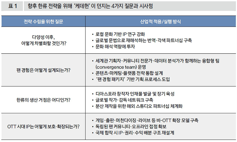 3. ‘케데헌’이 던지는 전략적 질문:지속가능한 한류를 위한 ‘넥스트 패러다임’케데헌을 주목해야 하는 이유는 단순히 올해의 화제작이기 때문이 아니다. 향후 K콘텐츠가 세계 시장에서 성장세를 유지하기 위해 어떤 ‘전략적 피벗(strategic pivot)’을 단행해야 하는지에 대한 모델을 제시하고 있기 때문이다. 한류의 지속가능성 관점에서 케데헌 사례가 시사하는 4가지 핵심 어젠다를 재정리하고자 한다.