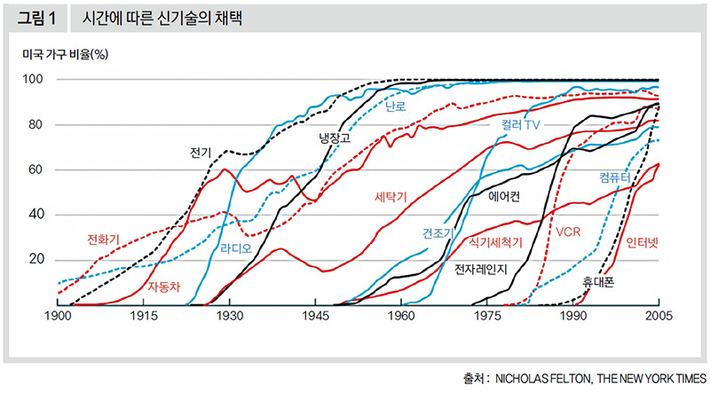 100년간 신기술에 대한 적응 속도를 보여주는 차트를 보자. (그림 1) 전화기를 나타내는 주황색 점선을 보면 1900년대 초반에 발명된 전화기는 1945년을 지나 미국 가정의 60%에 보급되는 데 45년이 걸렸다. 그리고 가장 우측의 주황색 실선인 인터넷은 15년 만에 같은 수준에 도달했다. 그렇다면 챗GPT는 얼마나 걸렸을까? 단 1년 만에 60%의 보급률을 달성했다. 오늘날 기술 채택 주기는 과거와 비교할 수 없을 정도로 빠르다. 이에 발맞춰 기업들의 R&D 투자도 급격히 늘어나고 있다. 지난 10년간 총 R&D 비용은 2배 정도 증가했다. 2010년 전 세계의 벤처캐피털 투자 가치가 약 481억 달러였다. 2021년 3분기 기준으로는 약 4000억 달러를 기록했다. 지난 10년간 혁신에 투입된 금액은 엄청난 수준이다. 기업형 벤처캐피털 펀드인 CVC의 투자금 역시 증가하는 등 조직 차원의 투자가 활발해졌다. 오늘날 우리는 엄청난 혁신의 시대를 살고 있는 셈이다.