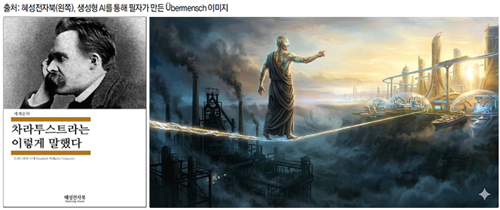 “인간은 짐승과 초인(Übermensch) 사이에 매여 있는 하나의 밧줄이다. 심연 위에 걸쳐 있는 하나의 밧줄이다.(Der Mensch ist ein Seil, geknüpft zwischen Tier and Übermensch – ein Seil über einem Abgrunde.)”