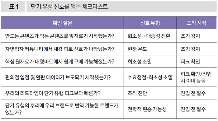 두쫀쿠 열풍과 제로 슈거 열풍의 차이가 이 지점에서 드러난다. 제로 슈거는 건강한 소비가 곧 즐거운 소비로 이어지는 ‘헬시 플레저’ 트렌드를 반영한다. 즉 소비자들의 소비 기준 자체가 건강을 중심으로 전환되는 시류를 읽고 그 흐름을 함께 만들어낸 것이다. 반면 두쫀쿠는 어떠한가. 당장 두쫀쿠를 구매하지 못해 슬픈 소비자는 있을지언정 두쫀쿠 자체가 소비의 기준 자체를 뒤흔들 제품은 분명 아니다. 현재의 유행과 소비자들의 소비 기준 사이의 관련성을 살펴봐야 하는 이유다.유행을 읽는 눈을 업그레이드할 때단기 유행과 트렌드, 메가트렌드를 구분하는 능력은 이제 기업의 선택 사항이 아니라 필수 역량이 됐다. 문제는 단기 유행의 속도가 빨라질수록 이 구분이 더 어려워진다는 것이다. 피크에서 대중화 단계까지의 시간이 불과 몇 주로 압축되면 기업은 판단할 시간이 없다고 느낀다. 그리고 서두르다가 파도가 지나간 자리에 뛰어든다.