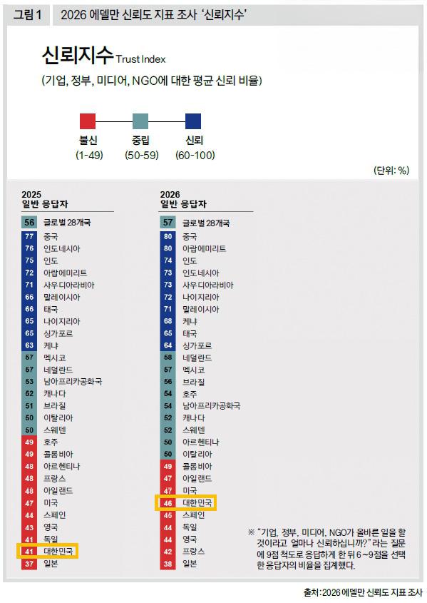 글로벌 PR 컨설팅 그룹 에델만코리아가 ‘2026 에델만 신뢰도 지표 조사(2026 Edelman Trust Barometer)’에서 대한민국 사회에 대한 결과를 발표했다. 이번 2026 에델만 신뢰도 지표 조사는 2025년 10월 25일~11월 16일 온라인 설문조사로 실시됐으며 전 세계 28개국 약 3만4000명이 참여했다. 조사 결과에 따르면 대한민국의 신뢰지수는 46%를 기록하며 여전히 주요 기관에 대한 불신 영역에 머물러 있는 것으로 나타났다. (그림 1) 에델만은 ‘양극화(2024)’ ‘시스템에 대한 불만(2025)’에 이어 올해 사회적 단절을 핵심 트렌드로 지목하면서 공통된 가치와 신뢰 기준이 해체되며 사회가 각자의 세계로 파편화되는 현상을 진단했다. 이에 한국 리포트의 주제로는 ‘고립 속의 신뢰(Trust Amid Isolation)’를 선정하면서 사회적 고립 심화가 신뢰 구조에 미치는 영향을 집중 분석했다.