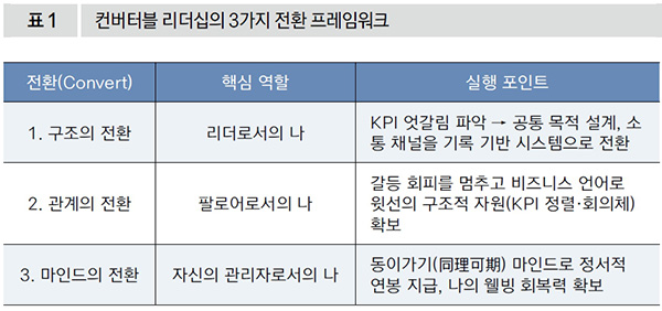 대화를 할 때 셀프 코칭하며 동이가기(同理可期)의 마음을 떠올려 주시기 바랍니다. ‘너와 나 서로가 이해하고, 가능성을 믿으며, 기대하고 기다리는 마음’입니다. 생산기획팀장이 지금은 답답한 장벽처럼 느껴지겠지만 그 역시 자신이 맡은 현장을 지키기 위해 고군분투하는 동반자입니다. 감정적인 호소가 아닌 구조적인 시스템과 진심 어린 존중을 무기로 테이블에 마주 앉는다면 이번 프로젝트는 두 부서가 서로의 다름을 시너지로 바꾸는 훌륭한 성공 사례가 될 것입니다.“목적에 맞게 중심을 잡고 생각과 행동을 유연하게 하는 리더”내 뜻대로 움직여주지 않는 타 부서 팀장의 성향을 내가 당장 개조할 수는 없습니다. 하지만 그 상황에 대응하는 나와 우리 팀의 접근 방식은 지금 당장 바꿀 수 있습니다. 컨버터블 리더는 무조건 참고 양보하는 착한 리더가 아닙니다. ‘가치와 원칙에는 단호하되 행동과 방식에서는 유연한’ 리더입니다.