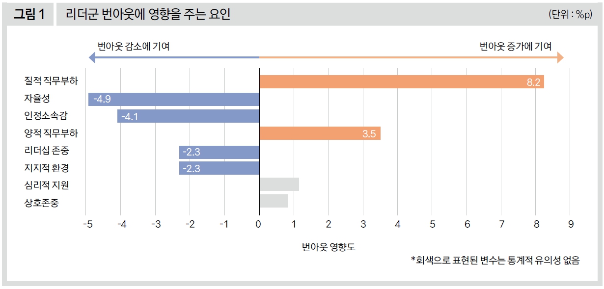 1) 업무량이 아닌 업무의 질데이터는 이를 엿볼 수 있는 몇 가지 단서를 제공했다. 첫째, 번아웃의 원인은 업무량이 아니었다. ‘업무의 모호함(질적 직무 부하)’이 업무량(양적 직무 부하)보다 번아웃에 2.3배 더 큰 영향을 미쳤다. 단순히 업무 과중에 시달리기 때문이 아니라 “왜 이 일을 해야 하지?” “왜 내가 맡아야 하지?” “일의 의미가 무엇이지?”라는 질문에 명확한 답이 없을 때 리더는 감정의 소진을 느꼈다. 즉 관리자의 직책을 맡고 있는 자가 자신의 일이 왜 중요한지, 어떤 가치를 창출하는지 모르면 방향 감각을 잃고 표류할 수밖에 없다.