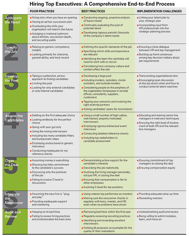 This article offers our best thinking about the most effective way to hire top-level managers, based on a combination of our own and established research about the relationship between recruiting and long-term corporate performance (see the research sidebar). The following is, to our knowledge, the first time that an end-to-end set of best practices has been put forward in one place. Our compendium comprises seven steps, which cover the full recruitment spectrum: anticipating the need for new hires, specifying the job, developing a pool of candidates, assessing the candidates, closing the deal, integrating the newcomer, and reviewing the effectiveness of the hiring process.