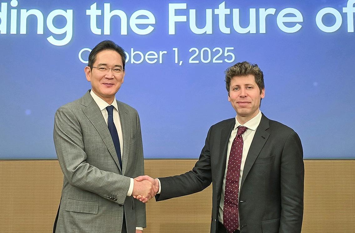 이재용 삼성전자 회장이 10월 삼성전자 서초사옥에서 열린 ‘글로벌 AI 핵심 인프라 구축을 위한 상호 협력 의향서(LOI) 체결식’ 당시 샘 올트먼 오픈AI 대표와 악수를 나누고 있다. 삼성전자 제공