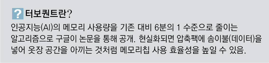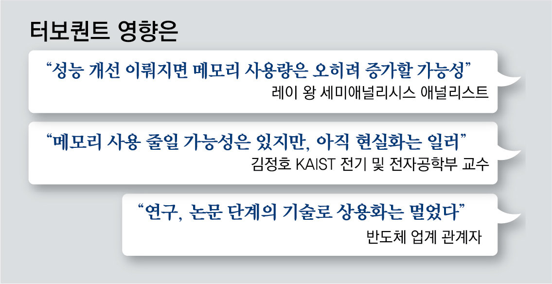 전문가들은 터보퀀트가 아직 이론만 나온 상태인 만큼 지켜봐야 한다는 입장이다. 김정호 KAIST 전기 및 전자공학부 교수는 “구글이 제시한 효과를 그대로 받아들이기는 아직 이르고 시장이 과민 반응하고 있다”며 “HBM을 직접 대체하기보다는 낸드플래시 기반 스토리지 활용 방식에 변화를 가져올 수 있을 것”이라고 덧붙였다.