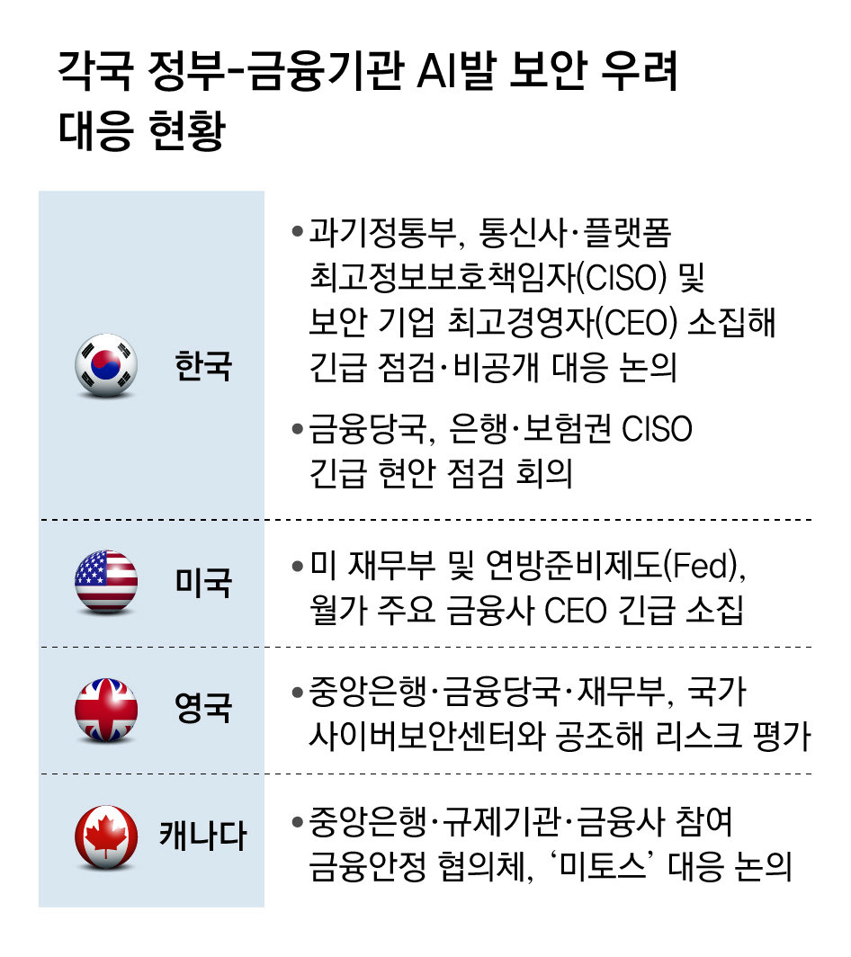 사이버 안보 지형을 뒤흔드는 고성능 AI의 등장에 각국 정부의 발등에도 불이 떨어졌다. 물리적으로 분리된 금융권의 ‘폐쇄망’마저 뚫릴 수 있다는 위기감에 스콧 베선트 미 재무장관과 제롬 파월 연방준비제도(Fed) 의장은 최근 주요 은행 최고경영자(CEO)들을 소집해 보안망 긴급 점검을 지시했다. 영국도 중앙은행과 금융행위감독청(FCA), 국가사이버보안센터(NCSC)가 합동으로 미토스의 금융권 파장을 정밀 평가하고 있다.