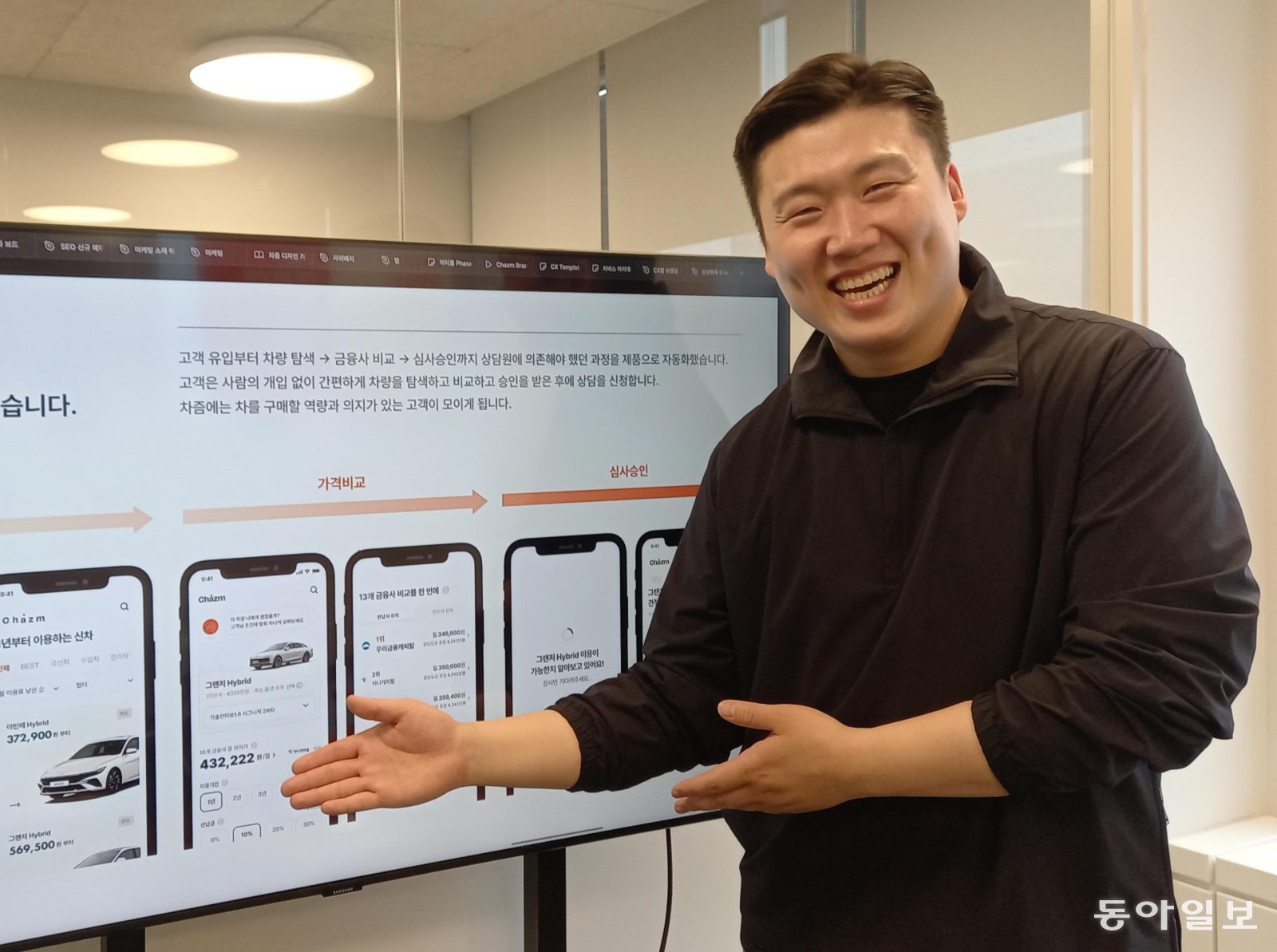 정상연 디자인앤프랙티스 대표가 10일 서울 강남구 사무실에서 ‘차즘’ 앱 서비스를 소개하고 있다. 정 대표는 “관행과 달리 상담사 전화를 기다릴 필요 없이 고객이 리스와 렌트 가격을 바로 확인할 수 있다”고 했다. 허진석 기자 jameshur@donga.com