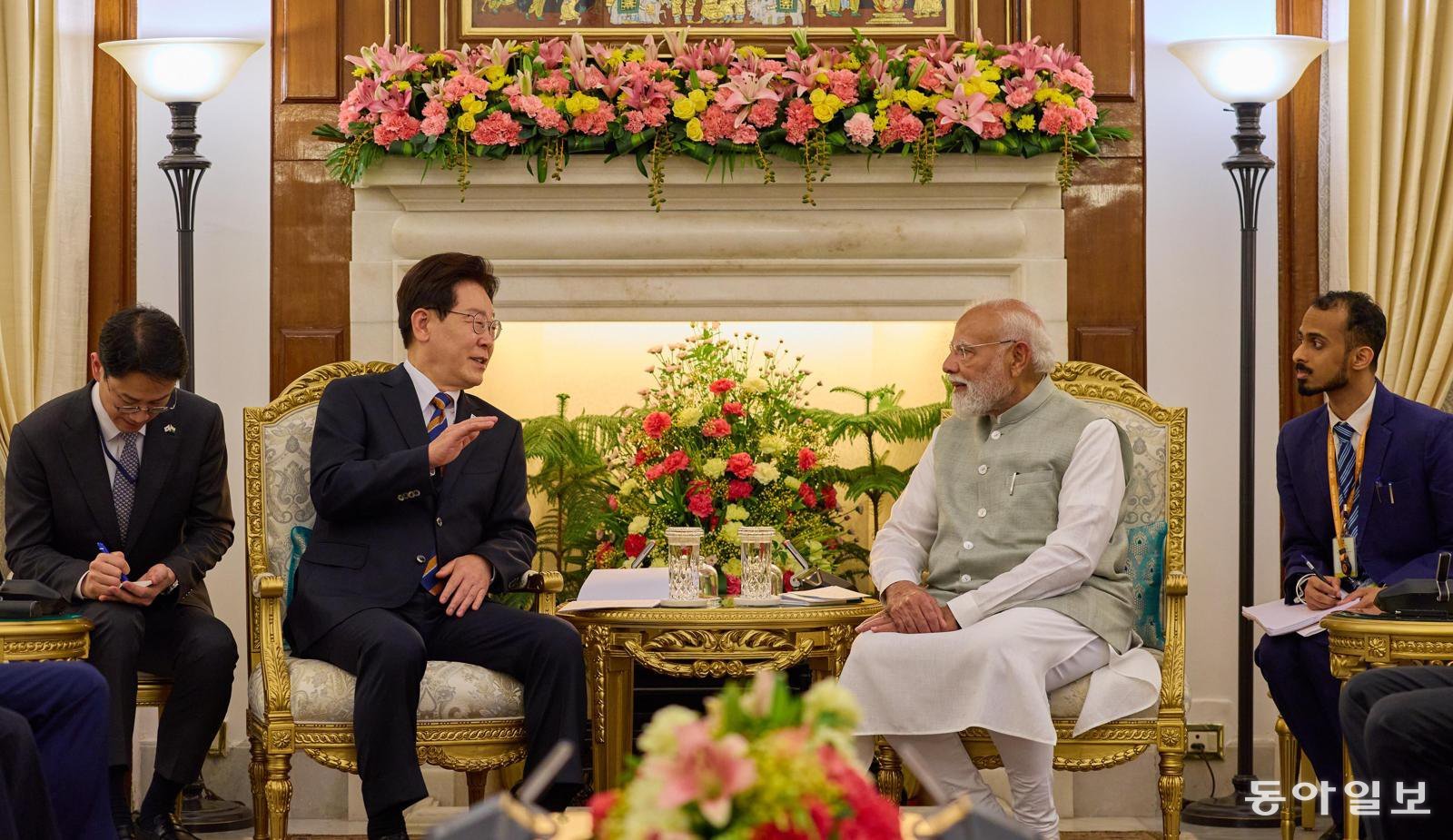● 李 “파도 두려워 항해 포기 안 돼” 이 대통령과 모디 총리는 이번이 세 번째 만남이다. 지난해 6월 주요 7개국(G7) 정상회의와 지난해 11월 주요 20개국(G20) 정상회의에서 두 차례 회동했다. 이 대통령은 소년공 출신인 자신과 ‘차이왈라(Chaiwala·인도식 홍차 상인)’ 출신인 모디 총리가 “공통된 삶의 궤적에 있다”며 친밀감을 드러냈다. 이 대통령은 모디 총리를 한국으로 초청했다고 밝히며 “모디 총리가 늦어도 내년까지는 한국을 방문하기로 약속했다”고 했다.