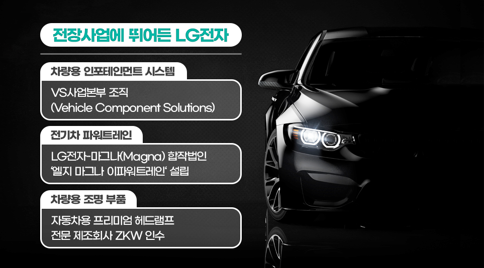 현재 LG전자 전장사업은 인포테인먼트(IVI)를 담당하는 VS사업본부, 전기차 파워트레인을 맡고 있는 LG마그나 이파워트레인, 차량용 조명 시스템을 담당하는 ZKW 등 ‘3각 편대’를 중심으로 운영되고 있습니다. 이들 사업은 각각 차량 내 디지털 경험, 구동 시스템, 차량 외관 및 안전 기술을 아우르며 전장 전반에서 시너지를 창출하고 있습니다.