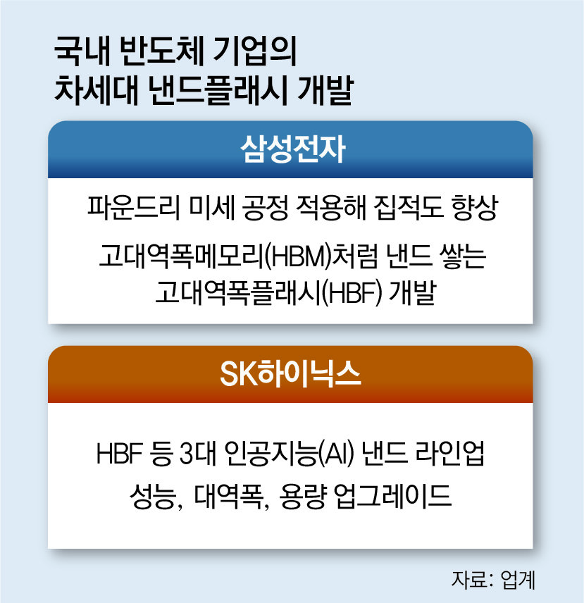메모리 반도체 업계가 인공지능(AI)발 호황을 맞아 D램뿐만 아니라 낸드플래시에서도 특수를 누리고 있다. 삼성전자와 SK하이닉스는 앞으로 낸드 수요 강세가 이어질 것으로 전망하면서 차세대 제품 개발에 속도를 내고 있다.