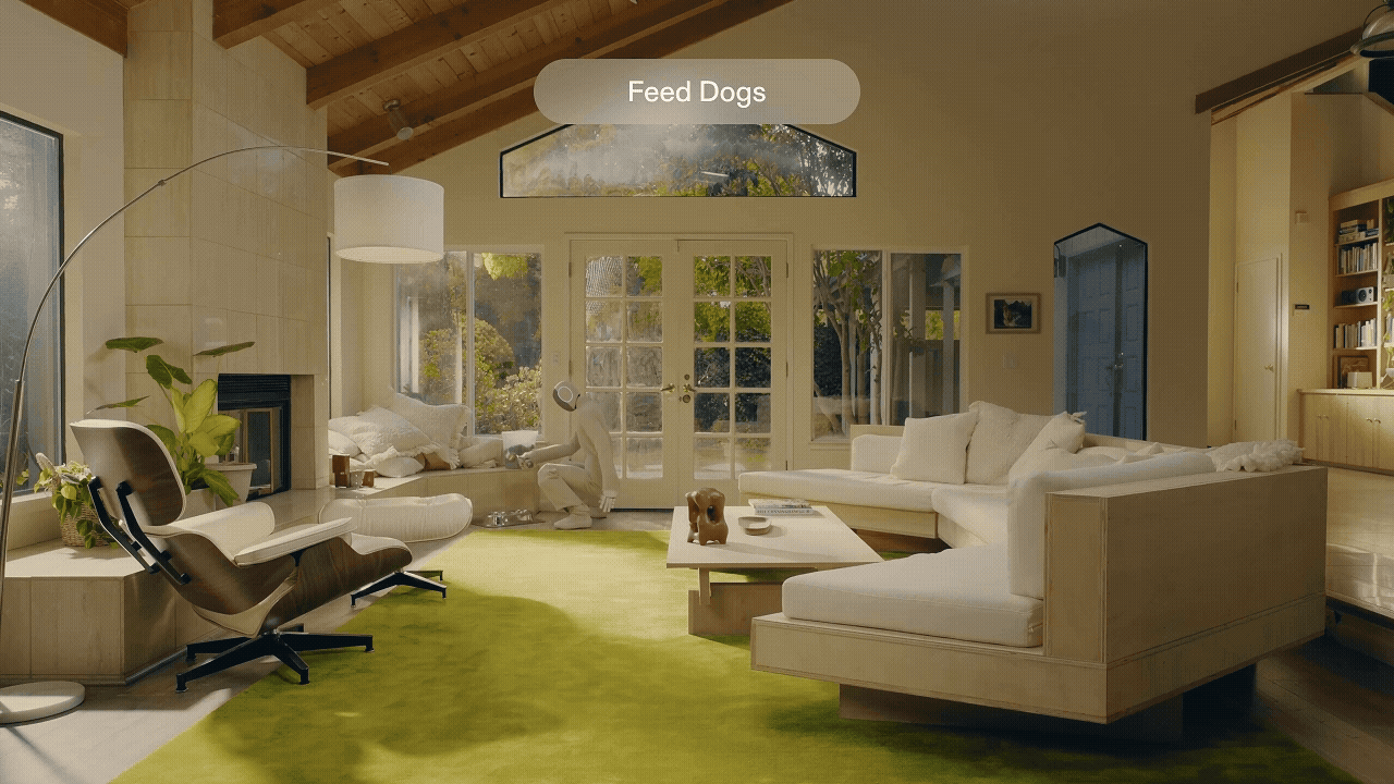 ‘네오(NEO)’가 집안에서 강아지 밥을 주고, 소파를 정리하며 빨래를 개는 등 다양한 집안일을 수행하고 있다. 사진=1X