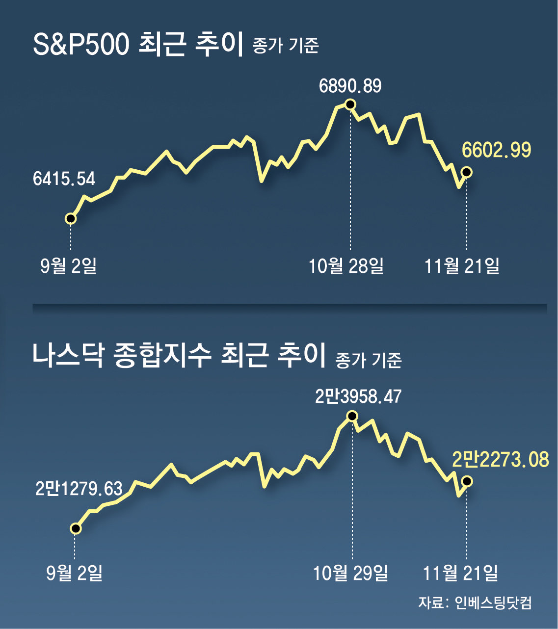 ● 엔비디아-오픈AI-오라클, 거미줄처럼 얽힌 거래 23일 한국거래소에 따르면 지난주(17∼21일) 코스피는 롤러코스터처럼 급락과 반등을 반복하다 3.95% 하락으로 장을 마쳤다. 뉴욕증시도 기술주 중심의 나스닥지수가 지난주 2.74%, 이달 들어 6.12% 하락했다. 증시 변동성 지수도 치솟았다.