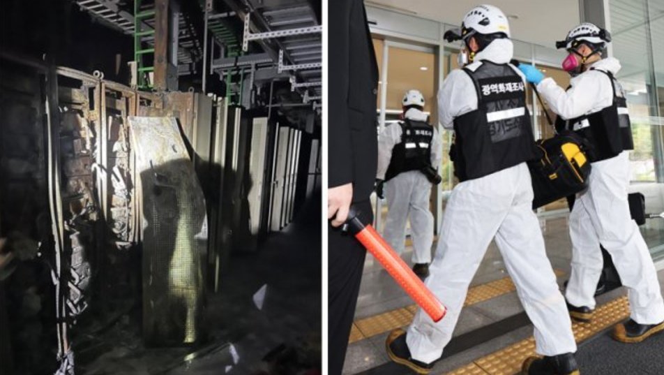The emergency battery burned and scorched in the electrical room on the 3rd basement floor of the SK C&C Pangyo Data Center in Bundang-gu, Seongnam-si, Gyeonggi Province (left), and the Gyeonggi Southern Police Agency's forensic team entering the building for on-site inspection / Source: Dong-A Ilbo